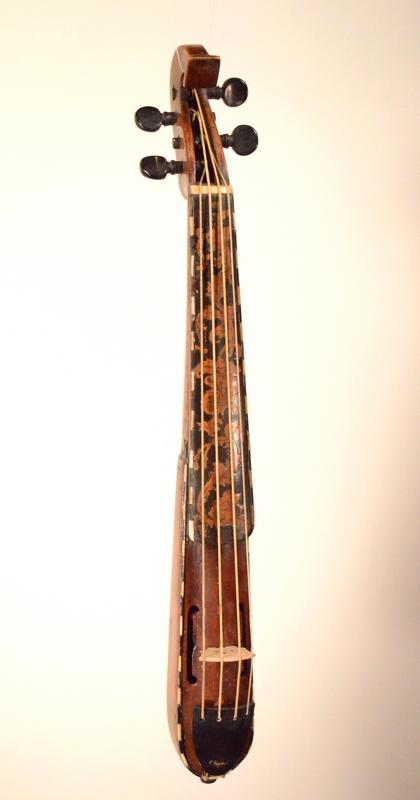 Fingerboard veneered of ebony with marquetry of floral design in boxwood.