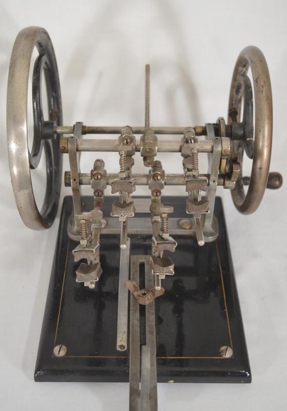 With the other hand the operator would crank the device in either direction in order to make the fingers travel up and down thus making them more nimble. The flywheel could be swapped in order to exercise both hands.